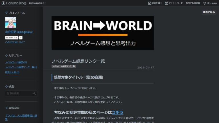 同人エロゲー、商業エロゲー、更新<少>、非エロ・R15 / 2021~、レビュー、雑記型 BRAIN⇒WORLD キャッチコピー ノベルゲーム感想と思考出力 サイト概要 ノベルゲーム専門のレビューサイト。更新は平均して月に2~3回と、やや少なめ。BRAIN⇒WORLD 掲載内容 新作から旧作まで、商業エロと全年齢の同人ゲームを半々くらいの割合で取り上げます。記事はネタバレを含む感想がメイン。文章量は作品のボリュームや完成度に応じてかなり差が大きく、1000~15000文字前後で変動します。画像は0~5枚前後。バックログのキャプチャを掲載して本編の文章をそのまま見せる使い方をしているため、ネタバレ度が高い点に注意が必要です。 サイトの見やすさ・利便性 PC版ではカテゴリーや検索がサイト上部に集められており、使いやすいです。記事は文章量に対してスペースが少なく、詰まって見づらい印象。また総評が非常に長く、主要キャラの印象を一人ずつ述べ始めるなど、構成上の問題点も見られます。 こんな人/こんな時にオススメ 管理人が好む作品に対しては非常に情緒豊かな文章が展開されており、共感できる人にとっては貴重な記事といえるでしょう。作品に感動し、感想を共有したくなったユーザーにオススメです。一方で未プレイヤーにはオススメしません。管理人のオススメほど「ユーザーの興味」と「管理人の想い」に温度差が生まれやすい記事内容のため、作品の魅力がうまく伝わらないかもしれないからです。記事全体がネタバレありきなのも難点。 リンク BRAIN⇒WORLDTwitter