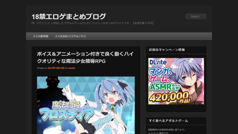 同人エロゲー、更新<並> / 2014~、レビュー、雑記型 18禁エロゲまとめブログ キャッチコピー PC(パソコン)に対応したアダルトゲームやエロフラッシュをまとめたサイトです。 サイト概要 人気作からマイナー作まで、同人エロゲを紹介している雑記型のレビューサイトです。姉妹サイトではスマホ対応のエロゲを紹介しています。18禁エロゲまとめブログ 掲載内容 同人エロゲのレビューを専門的に掲載しています。スマホ対応の作品を姉妹サイトと連携して紹介しているのが特徴。レビューサイトの感想としては簡素な内容で、文章量は少なく画像もタイトル画像のみです。 サイトの見やすさ・利便性 タグやカテゴリーがサイドバーに大量に並んでいるのはやや使いづらさを感じますが、ほとんど問題なく利用できるでしょう。黒ベースに白文字・赤文字というデザインは若干見づらさを感じるかもしれません。 こんな人/こんな時にオススメ レビューでは特筆すべき点が見られないサイトです。スマホに対応している同人エロゲを紹介しているので、スマホ対応作品を探している人には合っているかもしれません。あとはカテゴリー分けがかなり細かいので、特徴的な作品は探しやすいでしょう。ちなみにスマホ版はレビュー内容が変わりますが、スマホでプレイした感想という訳ではないようです。18禁エロゲまとめブログ タグ/カテゴリー 【タグ】同人エロゲー、更新<並> 【カテゴリー】2014~、レビュー、雑記型 リンク 18禁エロゲまとめブログR18同人エロゲ&美少女ゲーム集