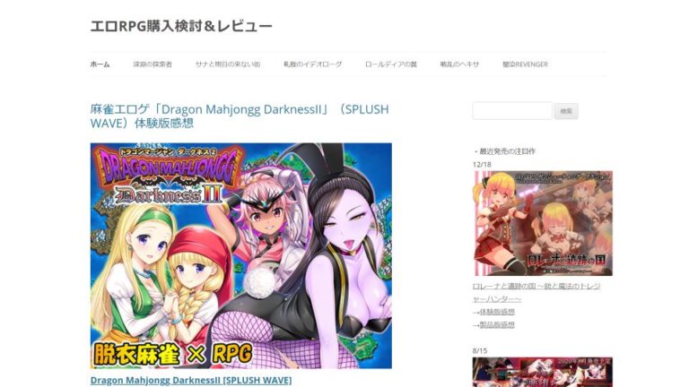 同人エロゲー、商業エロゲー、攻略 / 2014~、トレンド型、レビュー エロRPG購入検討&レビュー キャッチコピー 最新エロ同人RPGの体験版レビューや購入検討、プレイ日記や攻略などを書いてます サイト概要 注目度の高い新作を優先的に取り上げる、トレンド型のレビューサイト。サイトタイトルに「エロRPG」とありますが、RPG以外もレビューしています。エロRPG購入検討&レビュー 掲載内容 同人エロゲーの体験版レビューがメインコンテンツ。ただレビューというよりは「プレイ日記」に近い記事で、実際にゲームをプレイした時の体験を順に記載しています。製品版のレビューではクリアまでの道筋も詳細に書かれており、攻略記事としても有用です。 サイト/記事の見やすさ 記事の見やすさは特に問題ありません。しかしサイトはカテゴリやタグが分かりづらく、使い勝手は悪いです。記事の一部分が常に表示されているのもスクロールが面倒。また記事に使用されている画像は全てアフィリエイトリンクであることも注意が必要です。 こんな人/こんな時にオススメ ゲームをプレイしなくてもほとんど内容がわかってしまう詳細な記事で、画像も大量に使われています。ネタバレされてもいいから詳しく知りたい人にはピッタリです。ただし、読めば読むほど初見の楽しみを大きく損なうので注意。また「ゲームで行き詰ったが攻略サイトに記載がない」時にチェックしてみると、解決方法が見つかるかもしれません。エロRPG購入検討&レビュー タグ/カテゴリー 【タグ】同人エロゲー、商業エロゲー 、攻略【カテゴリー】2014~、トレンド型、レビュー リンク エロRPG購入検討&レビューTwitter