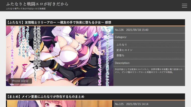 マンガ・CG集、同人エロゲー、更新<少> / 2020~、レビュー、特化型 ふたなりと戦闘エロが好きだから キャッチコピー ふたなり専門ってわけではないけど高頻度 サイト概要 ふたなりまたは戦闘エロがある同人エロゲを中心に扱う、特化型レビューサイトです。一般的なゲームを取り上げる場合もあります。ふたなりと戦闘エロが好きだから 掲載内容 主にふたなりや戦闘エロがある同人エロゲ、マンガ作品をレビューしています。レビューは非常に詳細で、1作品を2~4記事に分けて書くこともあるほど。これはあらすじやシステムの紹介以上に「エロの趣向はどういったものか」を言語化することに力を入れる方針を定めているから。「戦闘エロ好きにおすすめ」と、ジャンルを一括りにして安易に勧めて来ないのは他サイトにない特徴です。 サイト/記事の見やすさ 検索やカテゴリーがすべてサイドバーにあり、なおかつ格納されているのは少し使いづらい。それ以外はシンプルで、非常に見やすいです。 こんな人/こんな時にオススメ 「ふたなり」「立ち絵エロ」には一家言あるようで、両ジャンルが好きな人は大いに参考になるレビューです。特にふたなり好きとしてのコメントが多く見られ、「いかなる趣向のふたなりか」を掘り下げています。以上から、ふたなり作品を探している人には大変おすすめですが、それ以外の人には合わない可能性がある、と言えるでしょう。ふたなりと戦闘エロが好きだから タグ/カテゴリー 【タグ】マンガ・CG集、同人エロゲー、更新<少> 【カテゴリー】2020~、レビュー、特化型 リンク ふたなりと戦闘エロが好きだからTwitter