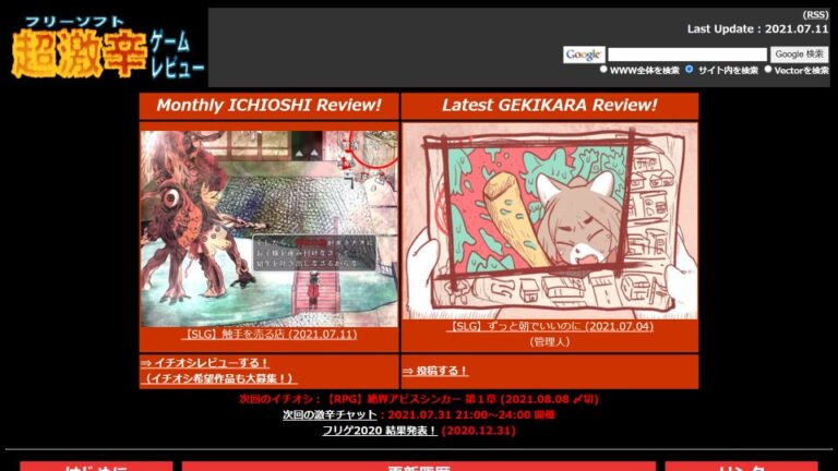 非エロ・R15 / ~2009、レビュー、特化型 フリーソフト超激辛ゲームレビュー キャッチコピー Windowsのフリーゲーム(無料のゲーム), ブラウザゲームを紹介する投稿式サイト サイト概要 Windowsでプレイ可能なフリーゲームを紹介・レビューするサイト。激辛とありますが、実際には作品をベタ褒めすることの方が多いです。誰でもレビューを寄稿できる、オープンな環境が特徴。フリーソフト超激辛ゲームレビュー 掲載内容 ほとんどが非エロのフリーゲームですが、18禁のフリーゲームや有料の同人エロゲーもわずかに掲載されています。文章主体で画像は多くありませんが、管理人のレビューはクオリティが高く、気になる” 引き ”を作って「プレイしてみたい!」という感情を巧みにあぶり出してきます。 サイト/記事の見やすさ サイトデザインは古いものの、サイトや記事はよく整理されています。しかし文字色と背景色のコントラストがキツく、長時間見ていると疲れるかも。またレビュアーが40人以上登録されており、文体や書き方がレビュアーによって変わるのも読みづらさを感じるところです。 こんな人/こんな時にオススメ 2000年には運営されていたと見られるため非常に古い作品もあり、掘り出し物を探すにはうってつけです。ただし、古い作品は現在も遊べるとは限らないので注意。また誰でもレビューの投稿が可能なので、お気に入り作品を紹介したい人には絶好の場です。フリーソフト超激辛ゲームレビュー タグ/カテゴリー 【タグ】非エロ・R15【カテゴリー】 ~2009、レビュー、特化型 リンク フリーソフト超激辛ゲームレビューTwitter