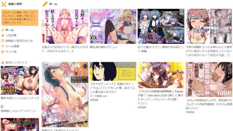 アニメ、マンガ・CG集、三次元・AV、同人エロゲー、商業エロゲー、更新<多> / 2020~、まとめ/ニュース 漫画と珈琲 キャッチコピー エロゲ・エロ漫画・同人・フィギュアなど、管理人が気になってる二次元系情報を集めたごった煮アンテナです。 サイト概要 他サイトで投稿された記事リンクのまとめサイトです。複数サイトの更新状態を一度に確認できるのが強み。漫画と珈琲 掲載内容 管理人が独自にピックアップしたサイトへの記事リンクを随時掲載しています。フィギュアやアダルトグッズに関するサイトも抜き出されており、二次元以外のエロについても情報が得られます。 サイト/記事の見やすさ 非常にシンプルな構造なので、迷うことはありません。 こんな人/こんな時にオススメ 1日に何度も更新されるため、個別にサイトを訪れるよりも効率よく情報収集ができます。ゲーム、マンガ、三次元など、エロ界隈の情報に対して幅広くアンテナを張りたい人にはピッタリです。ただし、自分の趣味に合うサイトを抽出しているかどうかは確認しておく必要があるでしょう。漫画と珈琲 タグ/カテゴリー 【タグ】アニメ、マンガ・CG集、三次元・AV、同人エロゲー、商業エロゲー、更新<多>【カテゴリー】 2020~、まとめ/ニュース リンク 漫画と珈琲Twitter同人エロゲうぉろろ~