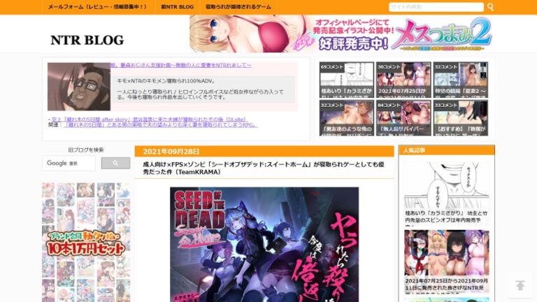 アニメ、マンガ・CG集、三次元・AV、同人エロゲー、商業エロゲー、更新<少> / ~2009、レビュー、特化型 NTR BLOG キャッチコピー 寝取られブログ。速報性の無い情報サイト。 サイト概要 寝取り・寝取られ・寝取らせ作品を専門とするレビューサイト。2006年から運営が続いている、非常に歴史の長いサイトです。NTR BLOG 掲載内容 メインはゲームとマンガ・同人誌ですが、「NTR」属性を含んでいれば作品形式を問わず紹介しています。読者からの情報提供を元に記事を作成している側面が大きく、記事へのコメントも多いです。そのためマンガは管理人自身で内容を確認のうえ紹介していますが、ゲームは寄せられた感想を元に取り上げ、具体的な内容に言及しない記事もあります。 サイト/記事の見やすさ 見出しを作ったり、記事と広告画像を分けたり、といったビジュアル面での工夫が全く見られません。特別見づらい訳ではないですが、見やすいとも言えません。 こんな人/こんな時にオススメ 読者からの情報を元に様々なNTR作品が掲載されています。質の高いNTR作品を探している人にはピッタリです。同時に、自分のもつ情報を提供したり、コミュニケーションを図る場としても利用できるでしょう。NTR BLOG タグ/カテゴリー 【タグ】アニメ、マンガ・CG集、三次元・AV、同人エロゲー、商業エロゲー、更新<少> 【カテゴリー】~2009、レビュー、特化型 リンク NTR BLOGTwitter