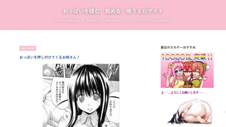 マンガ・CG集、三次元・AV、同人エロゲー、更新<多> / 2019~、レビュー、雑記型 おっぱいを揉む、舐める、吸うエロサイト キャッチコピー おっぱいを揉まれたり、舐められたり、吸われたりしている二次元や三次元の女の子を紹介 サイト概要 同人作品を中心に紹介する、雑記型のレビューサイトです。おっぱい関連のエロシーン画像が多いだけで、おっぱい責め作品に特化したサイトではありません。おっぱいを揉む、舐める、吸うエロサイト 掲載内容 取り扱いは同人エロゲー・同人誌が中心で、AVも多少含みます。記事はネタバレをほとんど含まず、マンガはあらすじ、ゲームはあらすじ+システムの解説に徹しています。むしろ解説に記事の大部分を費やしており、エロシーンの解説は少なめ。 サイト/記事の見やすさ 無駄が少なく、サイト・記事どちらも見やすいです。しかし「検索の場所がわかりづらい」「記事の分類がされていない」など、使い勝手はいまひとつ。 こんな人/こんな時にオススメ 画像選びが上手く、サムネイルの吸引力が強いサイトです。たくさんのおっぱいを見ているだけでムラムラしてくるので、エロゲーをプレイする前など、気分を高めたい時に使えます。ジャケ買いの要領で作品を選べるのも楽しいポイント。おっぱいを揉む、舐める、吸うエロサイト タグ/カテゴリー 【タグ】マンガ・CG集、三次元・AV、同人エロゲー、更新<多>【カテゴリー】 2019~、レビュー、雑記型 リンク おっぱいを揉む、舐める、吸うエロサイト