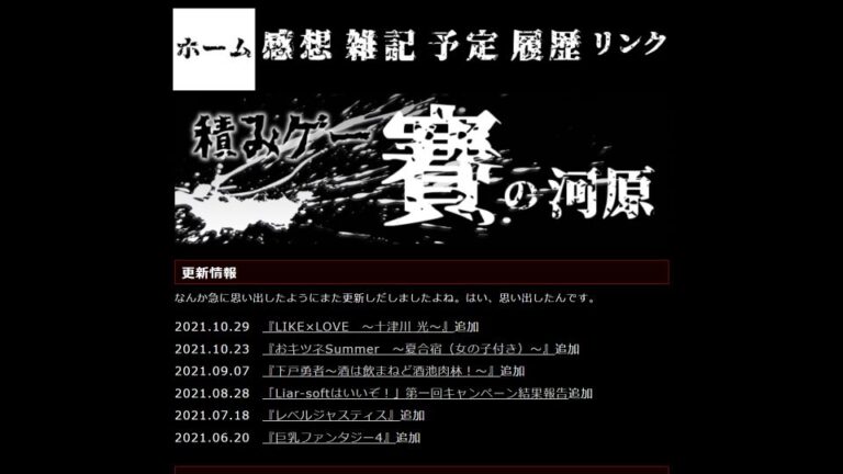 商業エロゲー、更新<少> / 2016~、レビュー、雑記型 積みゲー賽の河原 キャッチコピー アダルトPCゲームの感想を掲載しています。A~Fの6段階で評価し、プレイして思ったこと感じたことをタラタラ書かせていただいております。 サイト概要 商業エロゲを6段階で評価し、感想を掲載しているサイトです。2011年から運営されているようですが、2016年にリニューアルされてからの記事しか確認できないため「2016~」としています。積みゲー賽の河原 掲載内容 例外もありますが、掲載は基本的に商業エロゲのみ。記事は終始感想で、画像はもちろんシステムやあらすじなどの詳しい紹介は一切ありません。文章は筆者の知識量を感じさせる、勢いのある文体が特徴的。とりわけ評価の高い作品でこの傾向が見られます。 サイトの見やすさ・利便性 広告やサムネイル画像が一切なく、殺風景とも言えるページは見やすさに特化しています。しかし利便性の面では、サイト内検索が無い点や更新情報からは作品の評価が確認できない点など、若干の不便さが見られます。 こんな人/こんな時にオススメ 「めっちゃ早口で喋ってそう」と文章で感じさせる、非常に生き生きとしたレビューです。客観的な情報はそぎ落とされていますが、プレイした人間の熱量が残るレビューにはその作品がいかに良く、いかに悪いかをダイレクトに伝えてきます。一方で読者の都合を考えずに固有名詞やストーリーを放り込んでくるため、内容を全て理解するのは困難です。それでも読ませるパワーはありますが、エロゲや作品に関心が薄い人にはとことん合わないでしょう。積みゲー賽の河原 タグ/カテゴリー 【タグ】商業エロゲー、更新<少> 【カテゴリー】2016~、レビュー、雑記型 リンク 積みゲー賽の河原Twitter
