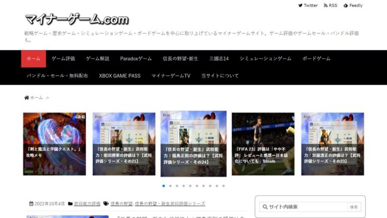 更新<少>、非エロ・R15 / 2016~、トレンド型、レビュー マイナーゲーム.com キャッチコピー 戦略ゲーム・歴史ゲーム・シミュレーションゲーム・ボードゲームを中心に取り上げているマイナーゲームサイト。ゲーム評価やゲームセール・バンドル評価も。 サイト概要 PC用を中心に一般ゲームを専門に紹介・レビューしているサイトです。更新頻度は月3回前後。マイナーゲーム.com 掲載内容 Steamで販売されているゲームを中心にレビューや紹介記事を掲載しています。ジャンルは全般を扱いますが、特にシミュレーションが多いです。具体的なゲーム内容やストーリーにはあまり触れず「遊びやすさ」「難易度」「ジャンル」をざっくりと書いているのが特徴。また良い点・悪い点をほかのユーザーから引用しており、客観的かつ複数の評価をまとめて確認できます。 サイトの見やすさ・利便性 必要な機能がサイト上部に集まっており、使い勝手は良好。記事も見出しやスペースをうまく使っており、スッキリしていて読みやすいです。 こんな人/こんな時にオススメ 1000~2000字以内に収められたテキストは読みやすいよう工夫され、要点もよくまとめられています。特に「どんな人が好むか」を明示することに焦点を当てた内容で、客観的な意見をもとに作品を選ぶ人に合うでしょう。またシミュレーションゲームの紹介が多いので、腰をすえてゲームをしたいガチ寄りのプレイヤーにもオススメです。 リンク マイナーゲーム.comTwitter